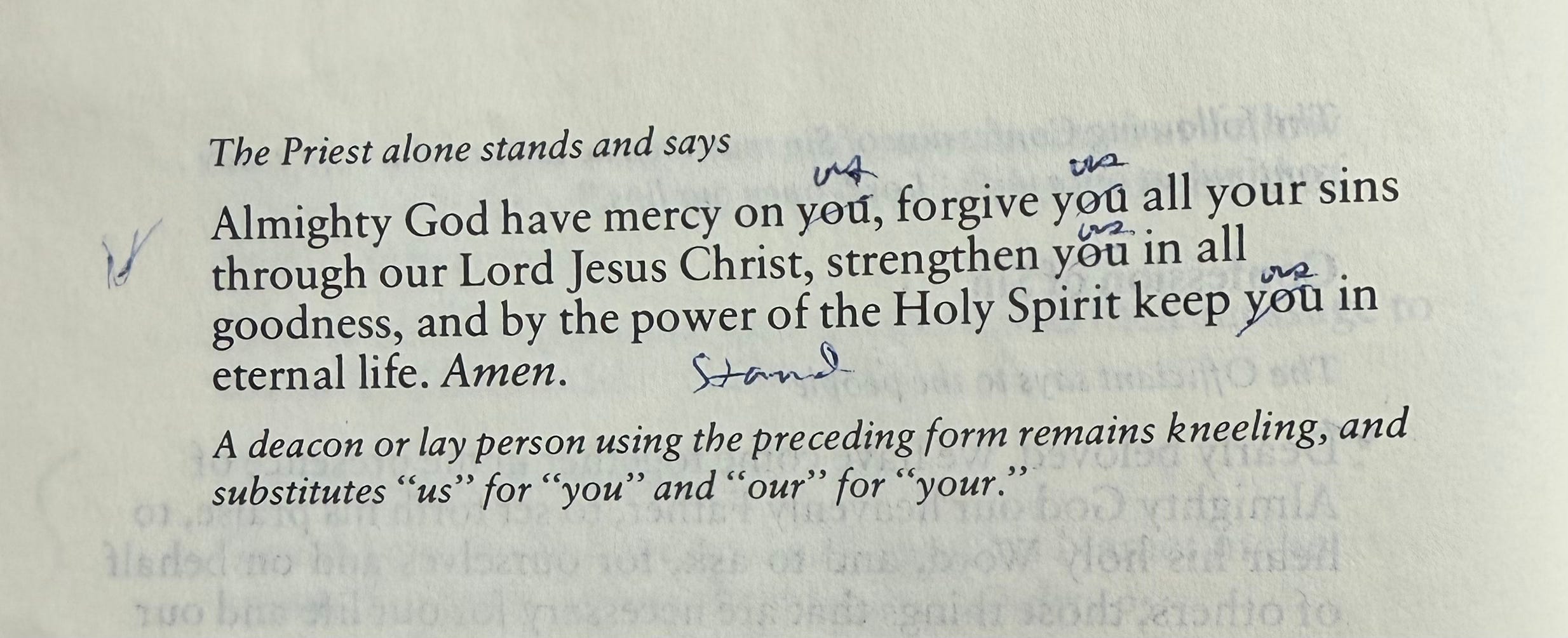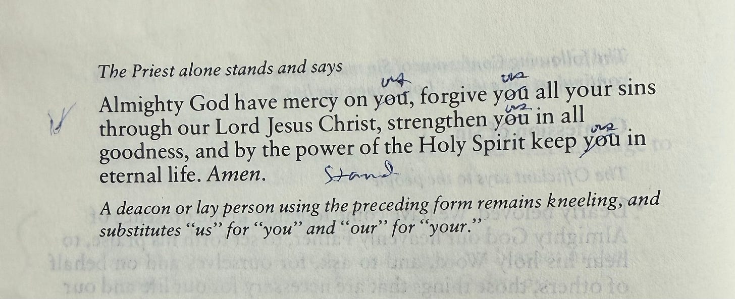 One of the first things I noticed, before more carefully reading the address to him by the priest, which revealed that he was a church warden (thus making my initial sleuthing efforts unnecessary), was that the word “you” had been crossed out by him in the absolution. I thought I was on to something. Only a priest or bishop says you, here. Instead, he penciled the word “us” above, and then he wrote “stand,” as if instructing himself. He took the postures seriously.